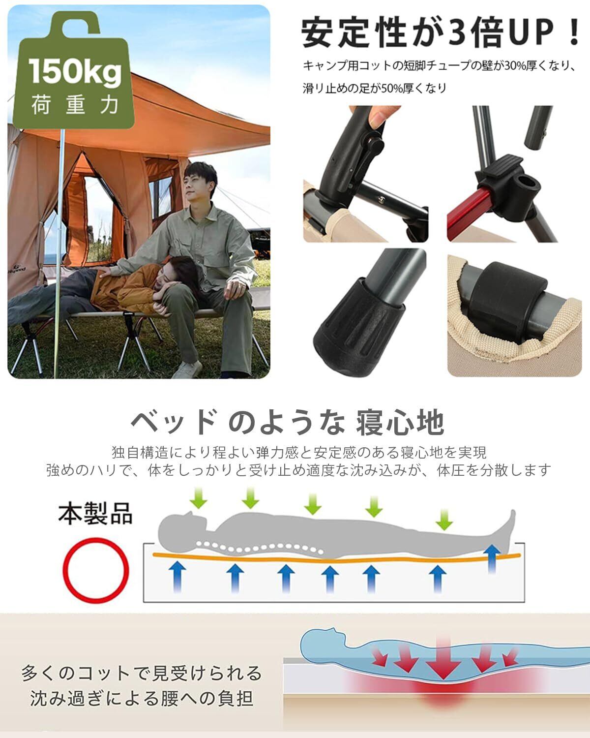 【もっと快適に心地よい睡眠を】 硬すぎず柔らかすぎず、適度な張りがあり心地よい。長さ190cm×幅65cmサイズ、男性が横にになっても十分なスペース、ありがちな変な軋み音もなく、寝返りも快適に出来て、沈んで地面につくこともなく、軽く沈む程度でベッドのような寝心地の良さ。地面から座面までの高さが17-38cm程度のコット、重心が低くて安定感がある、テント内で使用すると圧迫感を感じません、窮屈に感じることなく。