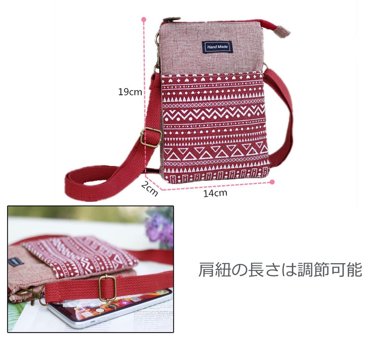 【サイズ】ポーチ高さ19cm、幅14cm、マチ:2cm。肩紐の長さは調節可能、ご身長や好みに合わせて自由に調節できますレディース スマホ ショルダーバック 。