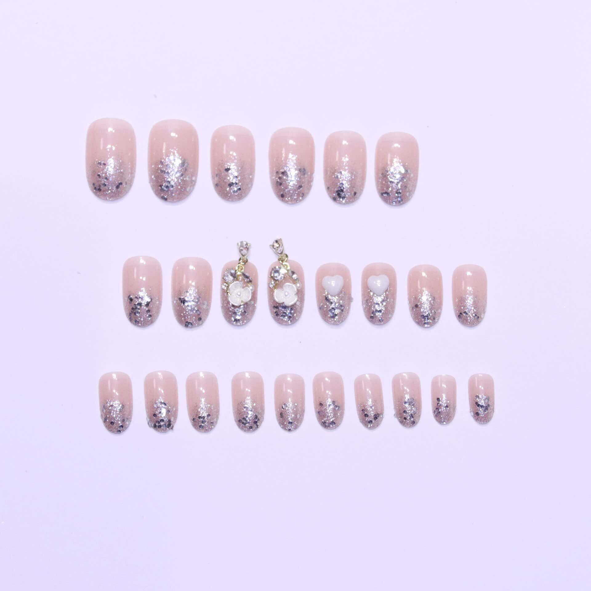 ヌードパウダー ネイルチップ 3D 小さな花柄 24枚入り フレンチネイル パール 結婚式、パーティ、休日、デート、プロム、日常生活に使用できます