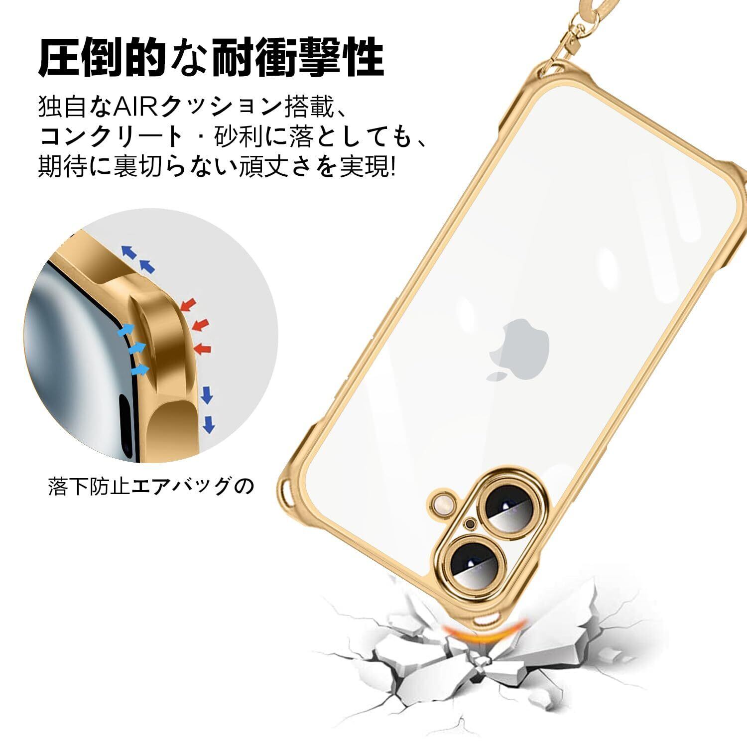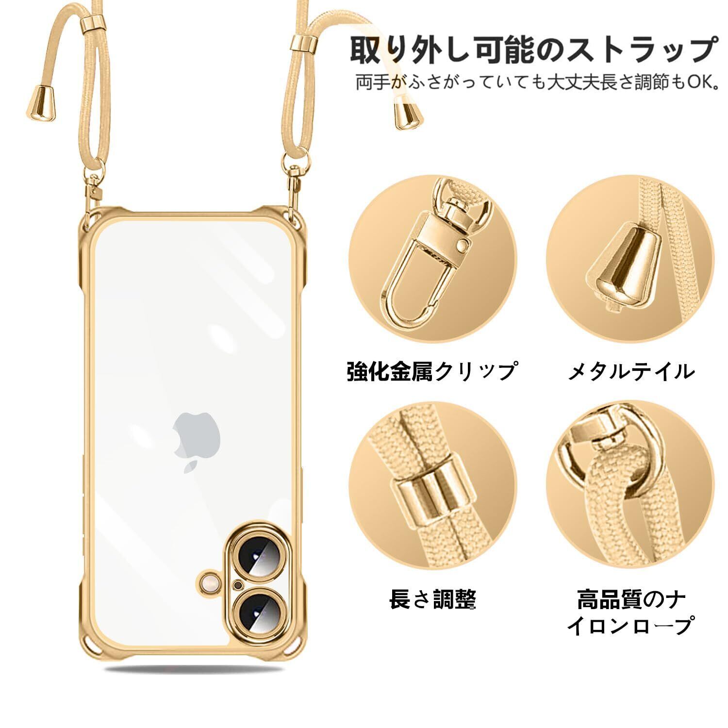 iPhone 16 Plus 用 ケース クリア ショルダー iPhone16plus 用 スマホケース アイフォン16Plus カバー 肩掛け 斜めかけ 縄掛けケース 透明 TPU 薄型 軽量 耐衝撃 携帯ケース 紐付き 斜めがけ 織りストラップ付き ネックストラップ ショルダー ケース 縦/横 2WAY 長さ調整可能 取り外し可能 落下防止 紛失防止 ワイヤレス充電対応 (ゴールド)