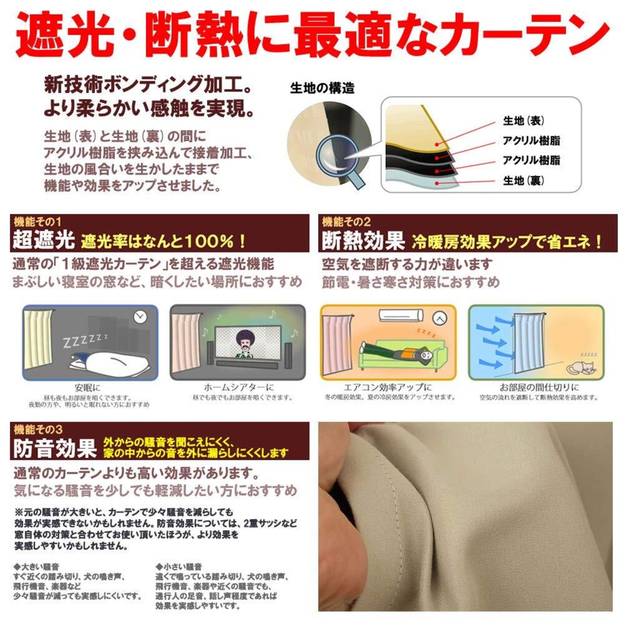 遮光等級:一級遮光(遮光率100%・完全遮光) 遮光率はカーテン生地に対する試験ですので、実際にカーテンとして使う場合、お部屋をかなり暗くするためには両サイドや上下部分も十分に覆うなどの工夫が必要です。驚異の遮光率100%!「ボンディング」という、生地と生地の間にアクリル樹脂を挟み込み接着する加工を施し物理的に空気を遮断、通常のカーテンよりも遮光断熱防音効果がアップ。生地(表・裏)は細かい織り目のとてもシンプルな完全無地の生地です。ほんの少しだけ毛羽だったような手触りです。生地の中にアクリル樹脂を挟み込んでいるとは思えないほどの柔らかさと言っていいと思います。表も裏も全く同じ生地なので、間仕切りにもおすすめです。<br>商品画像は巾100×高さ178cmの写真です。カーテンレールは付属しません。◆お使いのモニターや環境によって色の見え方が異なりますのであらかじめご了承下さい。