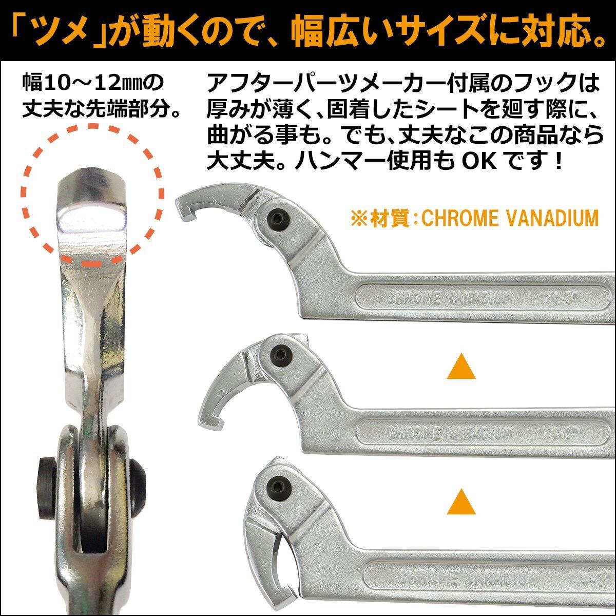 車の車高調、バイクのステアリングヘッド等のシートの緩締に使うフックレンチ クロムバナディウム製で耐久性に優れています。