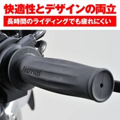 エルゴノミクス(人間工学)デザインを採り入れたデイトナオリジナルグリップ。グリップ力に優れるやわらかな素材を外側、硬めの素材を内側に組み合わせた2層構造により、長時間のライディングでも疲れません。縦にリブを立てた樽型グリップ。さまざまなスタイルにマッチします。