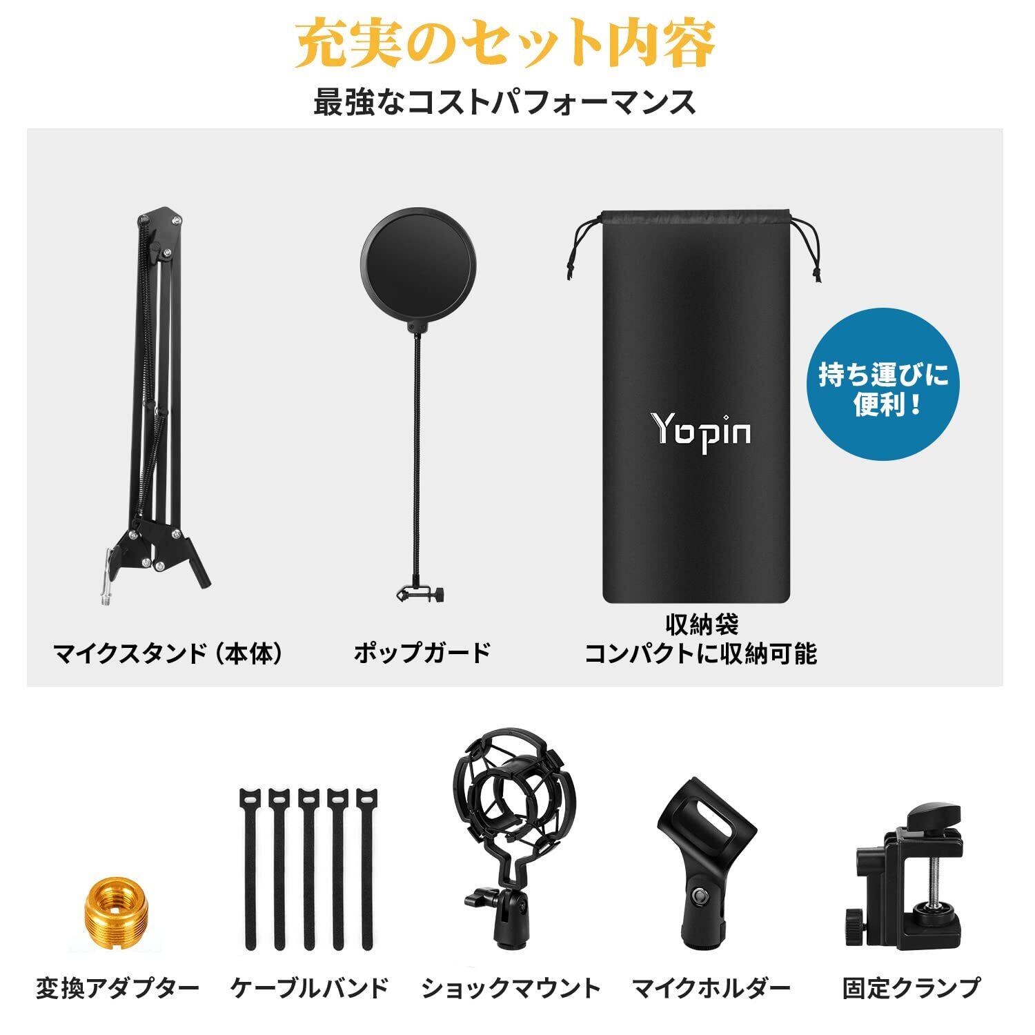YOPIN マイクスタンド マイクアーム コンデンサーマイク用 ダイナミックマイク用 伸縮 金属製 卓上マスタンド デスクアーム 収録 配信 実況 カラオケ ポップガード 変換アダプタ 収納袋 日本語取扱説明書付き