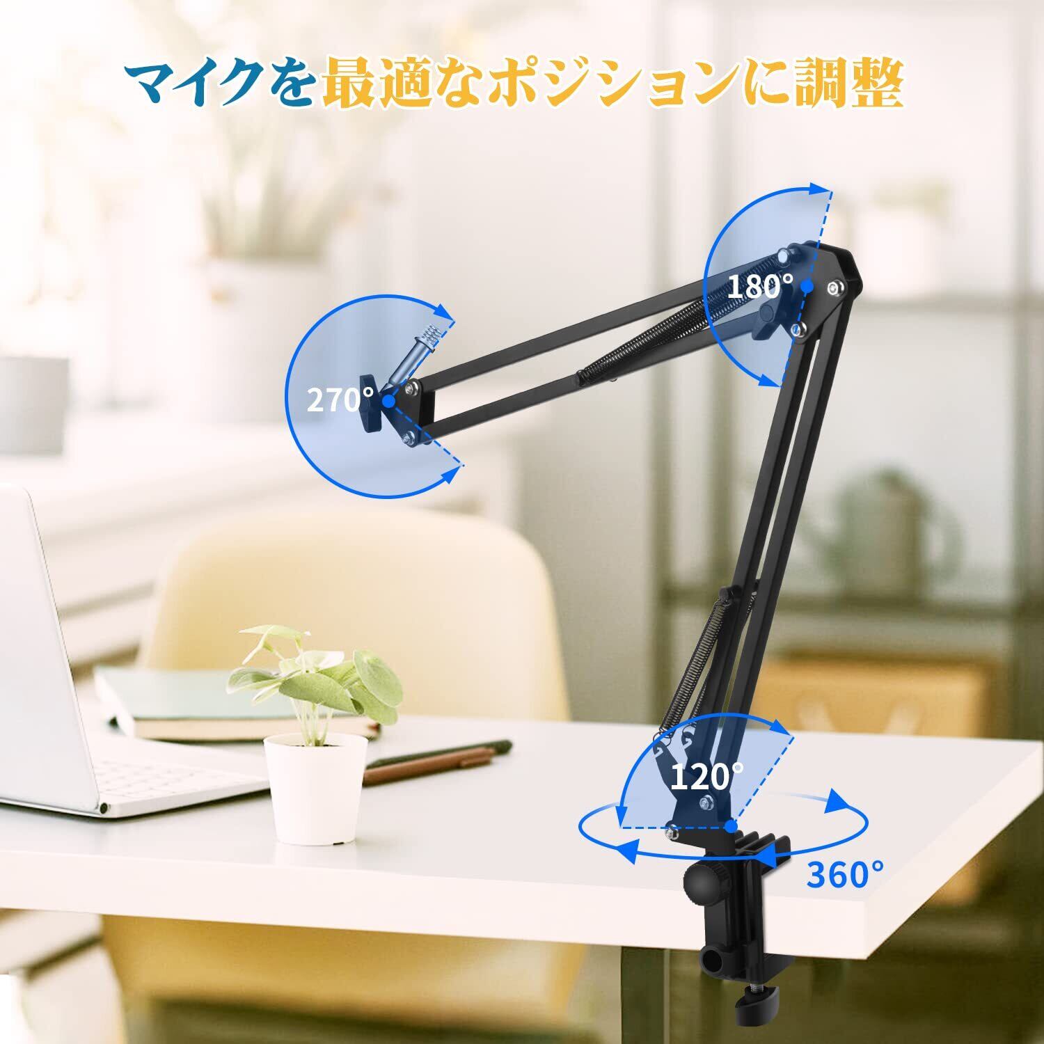 【360°自在にポジショニング】マイクスタンドを水平方向と垂直方向に固定できるため、卓上だけではなく、ベッドにでも固定できます。アームは改良されたデザインを採用し、回転可能な固定クランプと合わせると場所を取らず、360°自由にポジショニングを実現。