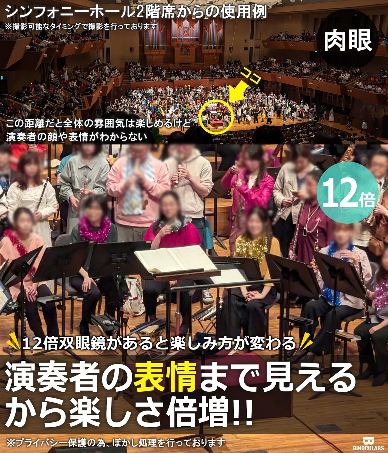 [利用シーン] 東京ドーム 京セラドーム paypayドーム 札幌ドーム 名古屋ドーム ライブ コンサート 推し活 スポーツ観戦 野鳥観察 発表会 運動会 競馬 競艇 競輪 など [倍率とは] 12倍の場合…100メートル離れたものを、肉眼で約8メートルの距離から見るのと同じ大きさで見ることが可能です。【12倍双眼鏡の使い道】1階席はより近くに、2階席以上は特に必須の倍率となります。ライブやコンサートなど、アーティストの表情を楽しみたいときや、風景などで対象物をより細部まで観察したいときにおすすめの倍率となります。