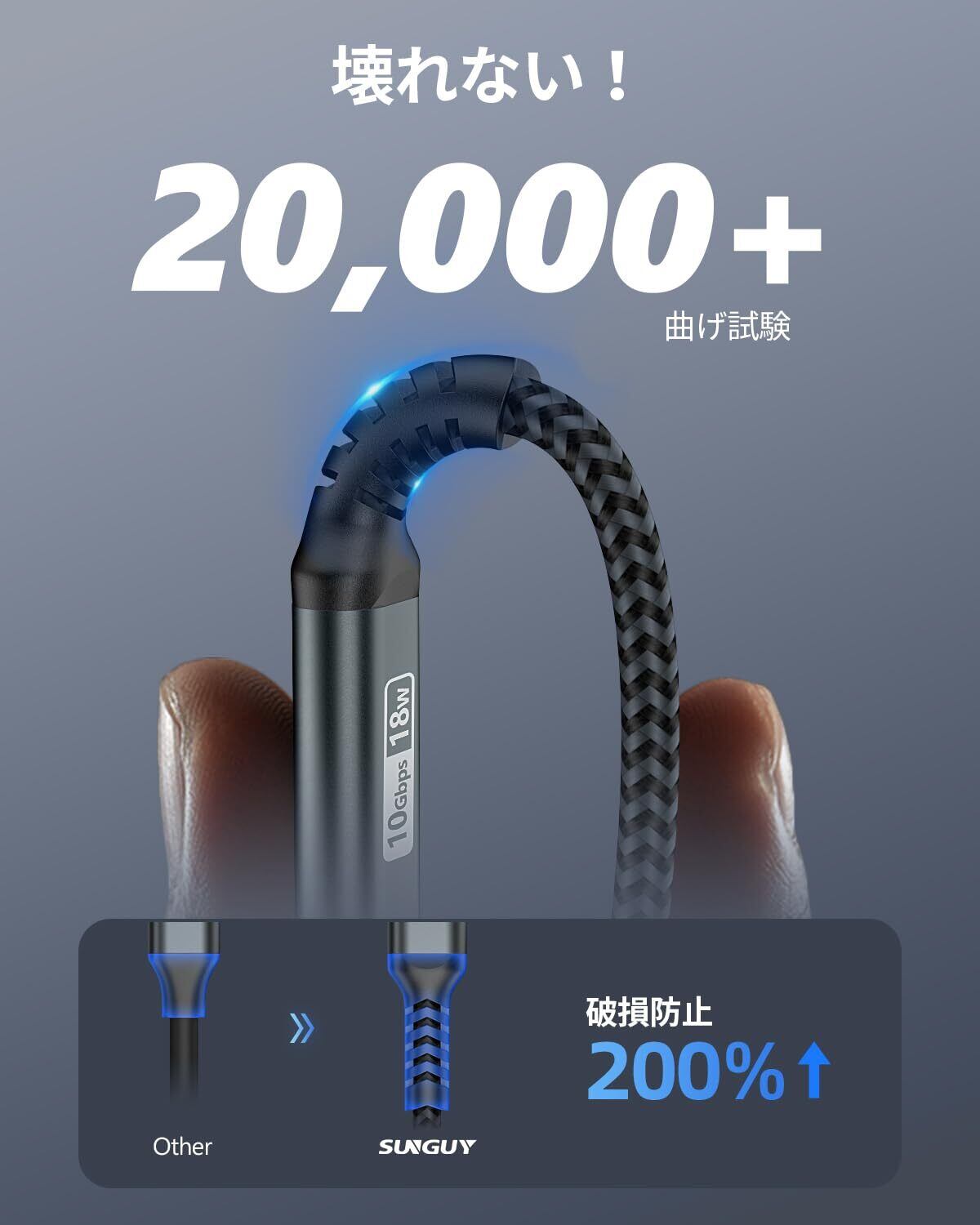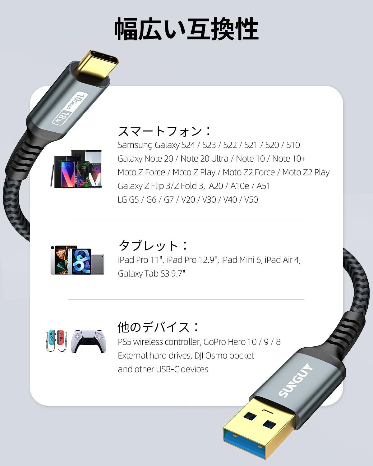 【Gen2 10Gbps 超高速データ転送】SUNGUY USB 3.1 type c ケーブルは、最大10Gbps高速データ転送をサーポートします。Gen1(USB3.0)より約2倍の速さ、HD映画や画像または音楽をわずか数秒で転送できます。それにQC3.0/2.0対応、短時間内に充電も完了します。ご注意:映像出力は非対応です。