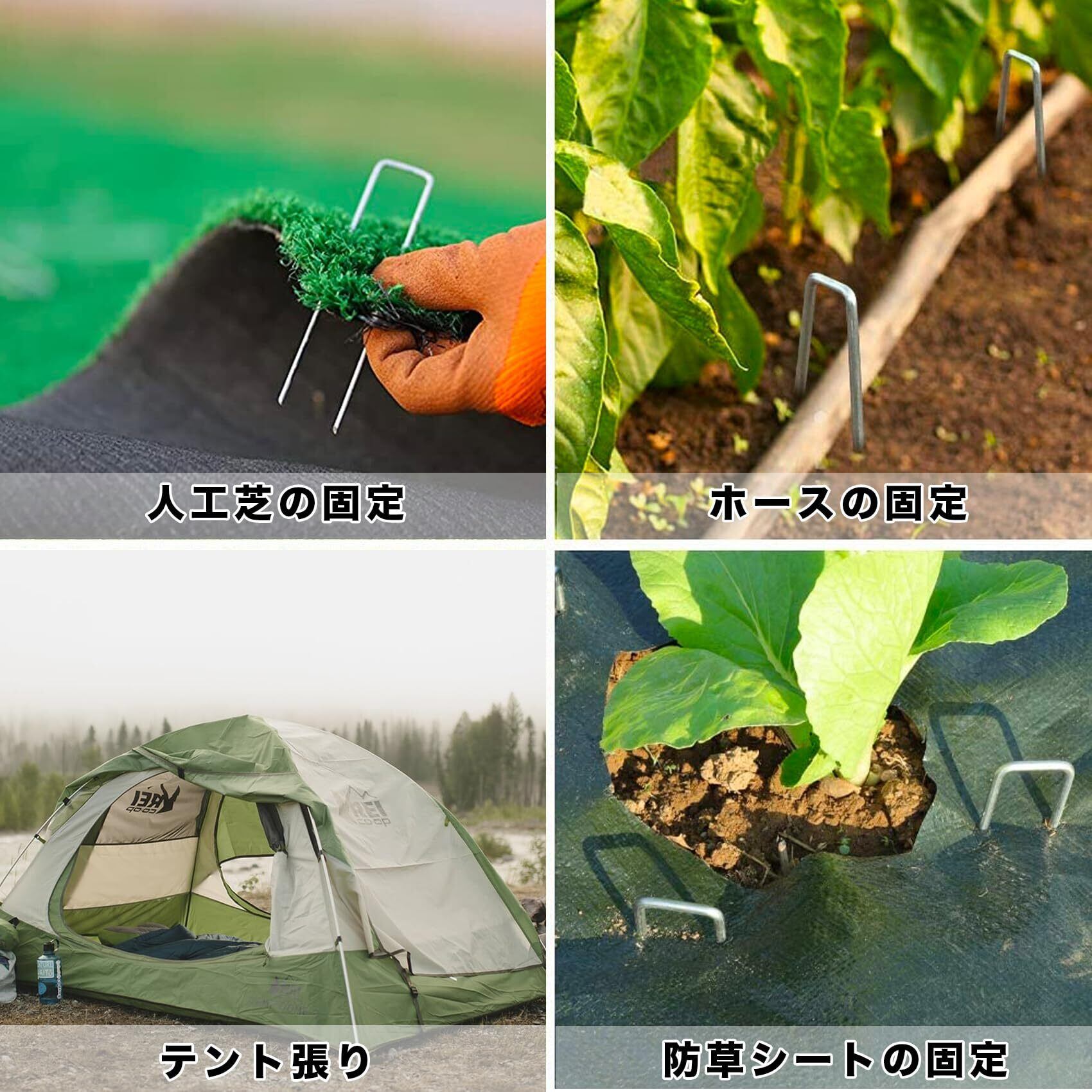 【マルチシーン対応】Uピンは、人工芝、防草ボード、テント、不織布、プラスチックマルチなどの設置や固定に使用できます。テントの固定ピンとしても使えます。
