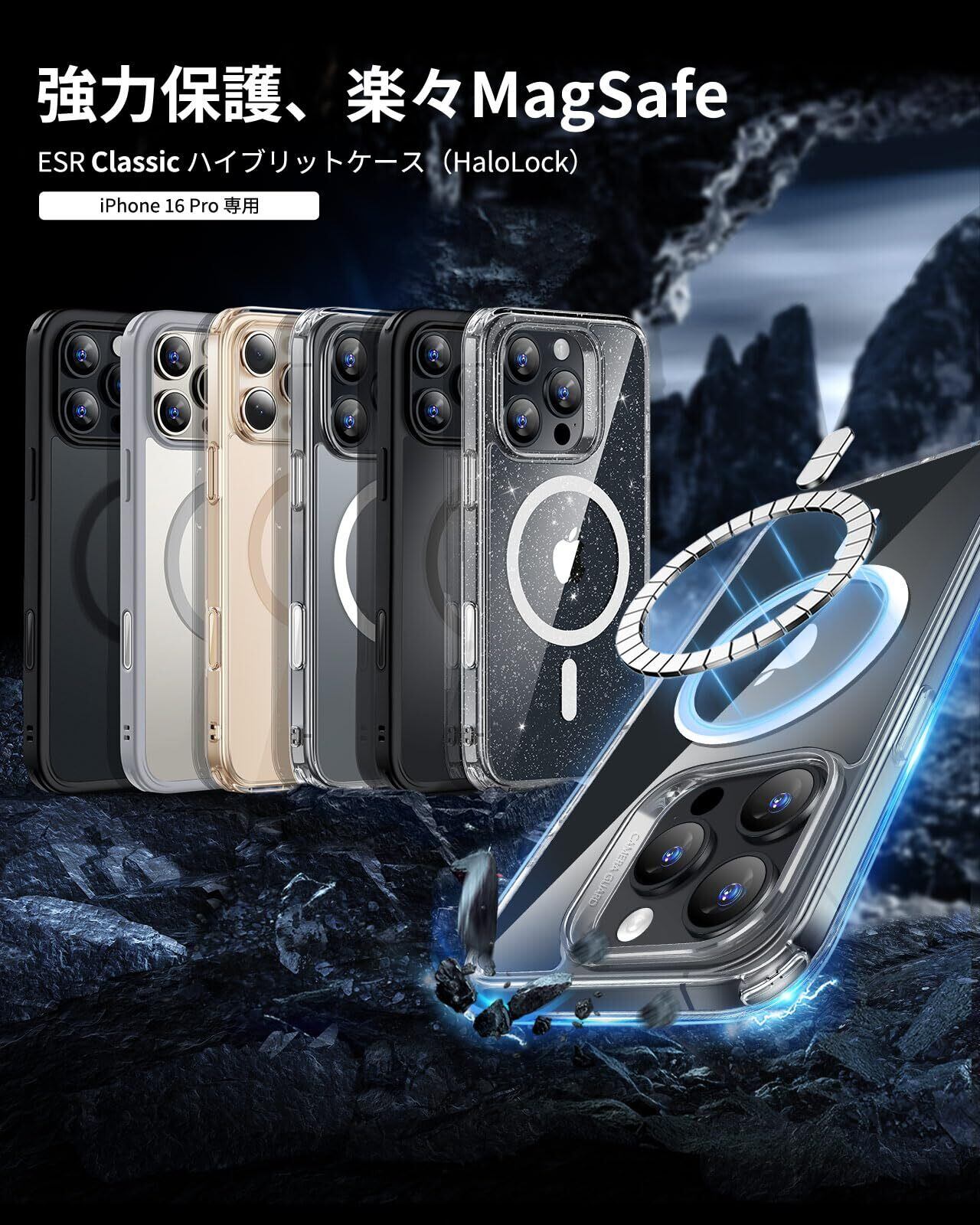 ESR いPhone16Pro ケース【カメラコントロール・Magsafe対応】傷に強い背面 ワイヤレス充電 ストラップホール付き iPhone 16 Pro ケース 耐黄変 耐衝撃 iPhone 16pro対応 HaloLock搭載 ハイブリッド磁気カバー クリア_ブラック