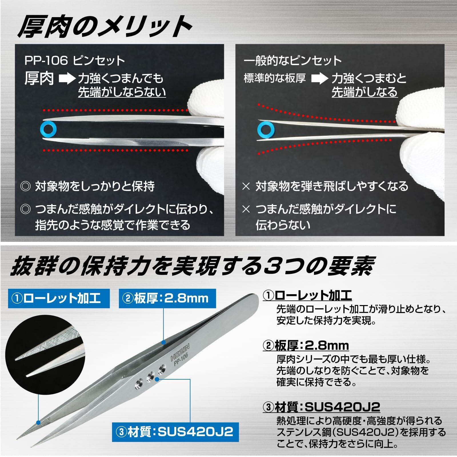 ・【材質】ステンレス(SUS420J2)【重量】29g【全長】125mm【板厚】2.8mm【先端幅】0.3mm【用途】部品交換・組立作業、ハンダ付け、ネジ掴み、プラモデル・模型・アクセサリーの製作、ネイルアート用ツイーザー、まつエク、ダイヤモンドアート、ビーズワーク、アイロンビーズ、手芸、標本製作、ペーパークラフト、ポーセラーツ、園芸