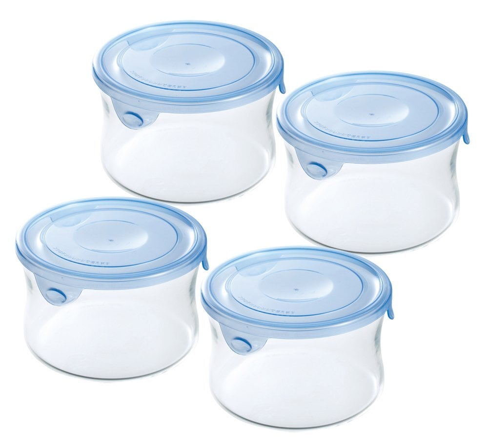iwaki(イワキ) 耐熱ガラス 保存容器 アクアブルー 丸型 S 490ml ×4個セット パック&レンジ KBT7401HBL
