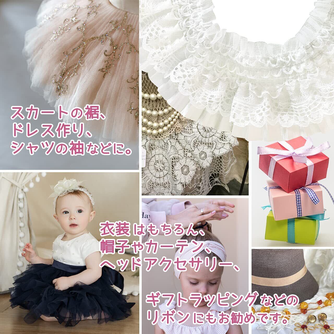 "· 贅沢にフリルやチュール、ギャザーが組み合わされた手芸用レースリボンです。幅広タイプ(8cm幅)のレース生地で、上品に華やかさをプラスします。 · スカートの裾、ドレス作り、シャツの袖などに。衣装だけでなく、帽子やカーテン、ヘッドアクセサリー、ギフトラッピングなどのリボンにもお勧めです。 · 小物の装飾材料にも。キャンドルや花瓶のデコレーション、パーティーやクリスマスなどのイベント装飾にも。 · お財布やネックレス、ブレスレットなどのDIYハンドメイド手芸素材や、アルバム、日記、手帳の飾りの手芸用品にも。華やかさをプラスしながら、自分だけのオリジナルグッズを作りましょう。 · 幅:約9cm 長さ:約4ヤード(約3m60cm)
