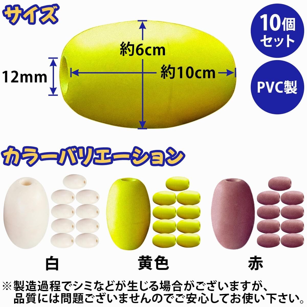 【仕様】 サイズ:本体 約6cm×10cm / 中通し穴 内径12mm 材質:PVC製 バリエーション:白色 / 黄色 / 赤色