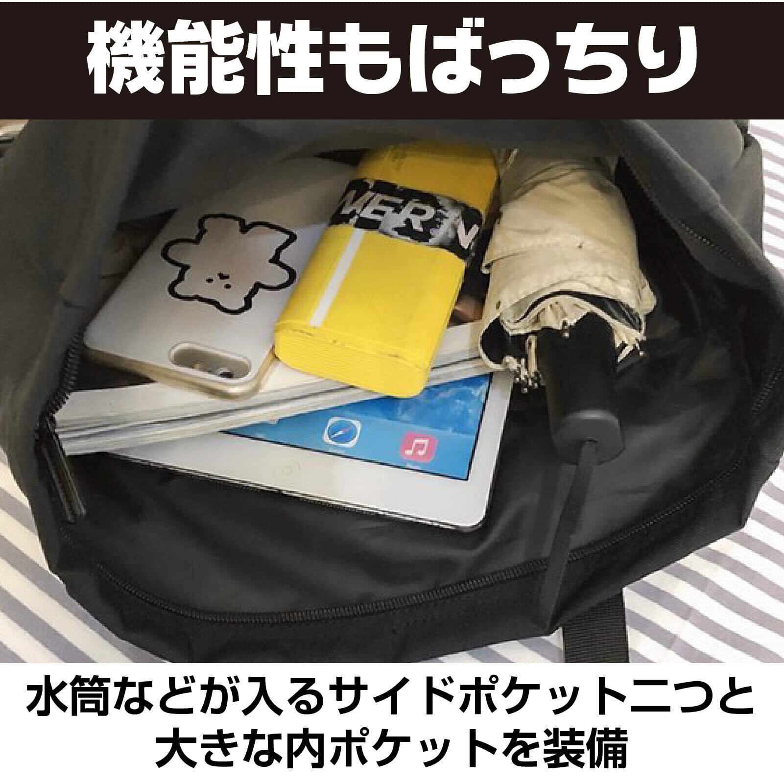 《機能性》 リュックは撥水素材で急な雨も安心。水筒などが入るサイドポケット二つと、大きな内ポケットを装備。デザインだけでなく、機能もばっちり!