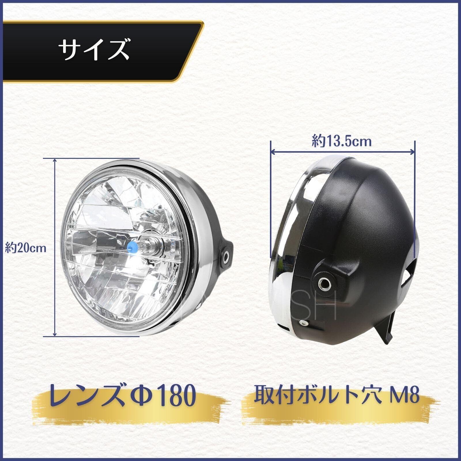【サイズ】直径 約 21cm 奥行き 約 14 cm取り付け部ボルト穴:M8レンズ径:180パイダイヤモンドカットレンズ。古くなった ヘッドライト の 交換用 にお勧めです!※配線部分は防水仕様ではございませんので、お客様の方で防水加工をお願い致します。 ※取付サポートは行っておりません。取り付けが不慣れな方は専門の業者にお任せください【スタイリッシュなデザイン】 ベースはマットなブラック。 シルバーのリムがスタイリッシュな印象を与えます。 ヘッドライトシェル・リム・ハロゲンライトのAssyなので、 今流行のマルチリフレクターへ簡単にステージアップすることができます。【目に優しいライトを搭載。】 高寿命ハロゲンライトを搭載。 30000時間以上使えるため、コストパフォーマンスに優れています。 樹脂製レンズで割れにくく、曇りにくいため、雨の日や冬でも安全な走行が可能です。【バイクカスタムに最適】 サイズが合えば様々なバイクに移植が可能。カスタマイズに最適です。 純正品と比べ、安価に交換が可能。 コストパフォーマンスが高い製品となっています。【バイクカスタムに最適】 サイズが合えば様々なバイクに移植が可能。カスタマイズに最適です。 社外品なので、純正品と比べ、安価に交換が可能。 コストパフォーマンスが高い製品となっています