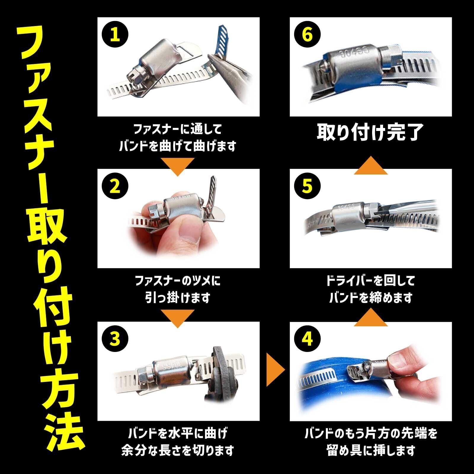 【取り付け方法】: 取り付けたいパイプの円周を測り、ホースバンドを測った長さより多めの長さにペンチ等で切断し、ファスナーを取り付けます。パイプにバンドをまき、ドライバーやソケットで固定ネジを締めます。