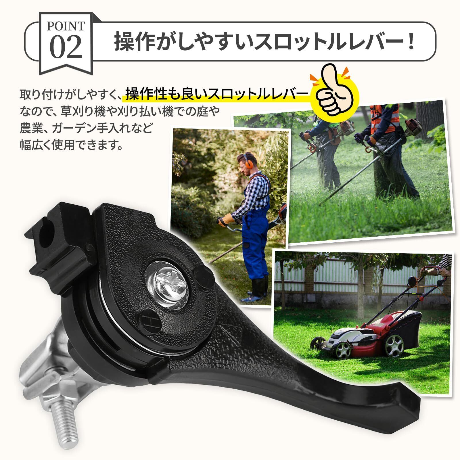 取り付けがしやすく、操作性も良いスロットルレバーなので、草刈り機や刈り払い機での庭や農業、ガーデン手入れなど幅広く使用できます。