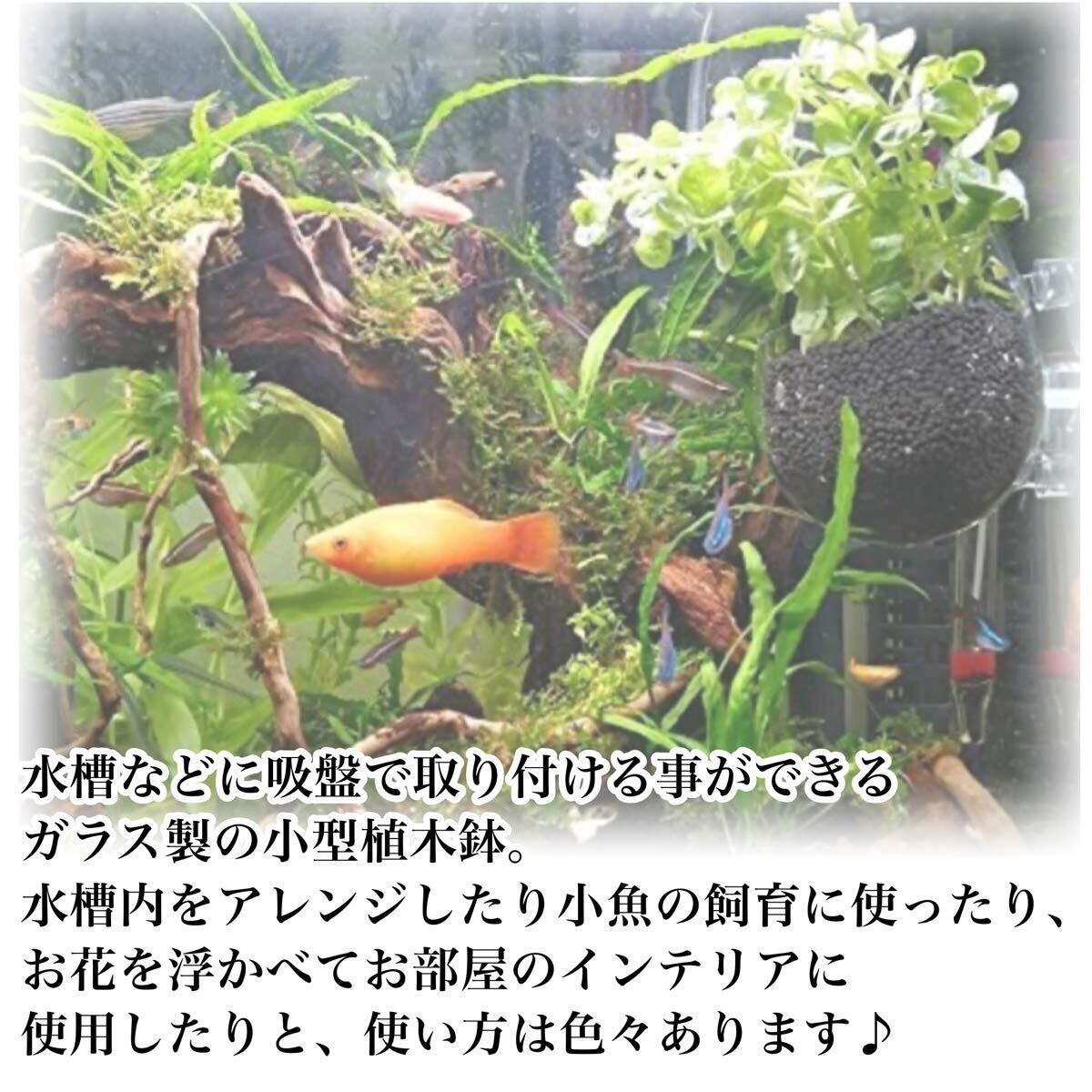 【1】吸盤で水槽のガラス面に取り付け可能なガラス製の小型植木鉢です。底面に小さな穴が開いているので、水槽上部にセットし水上葉もお楽しみいただけます。