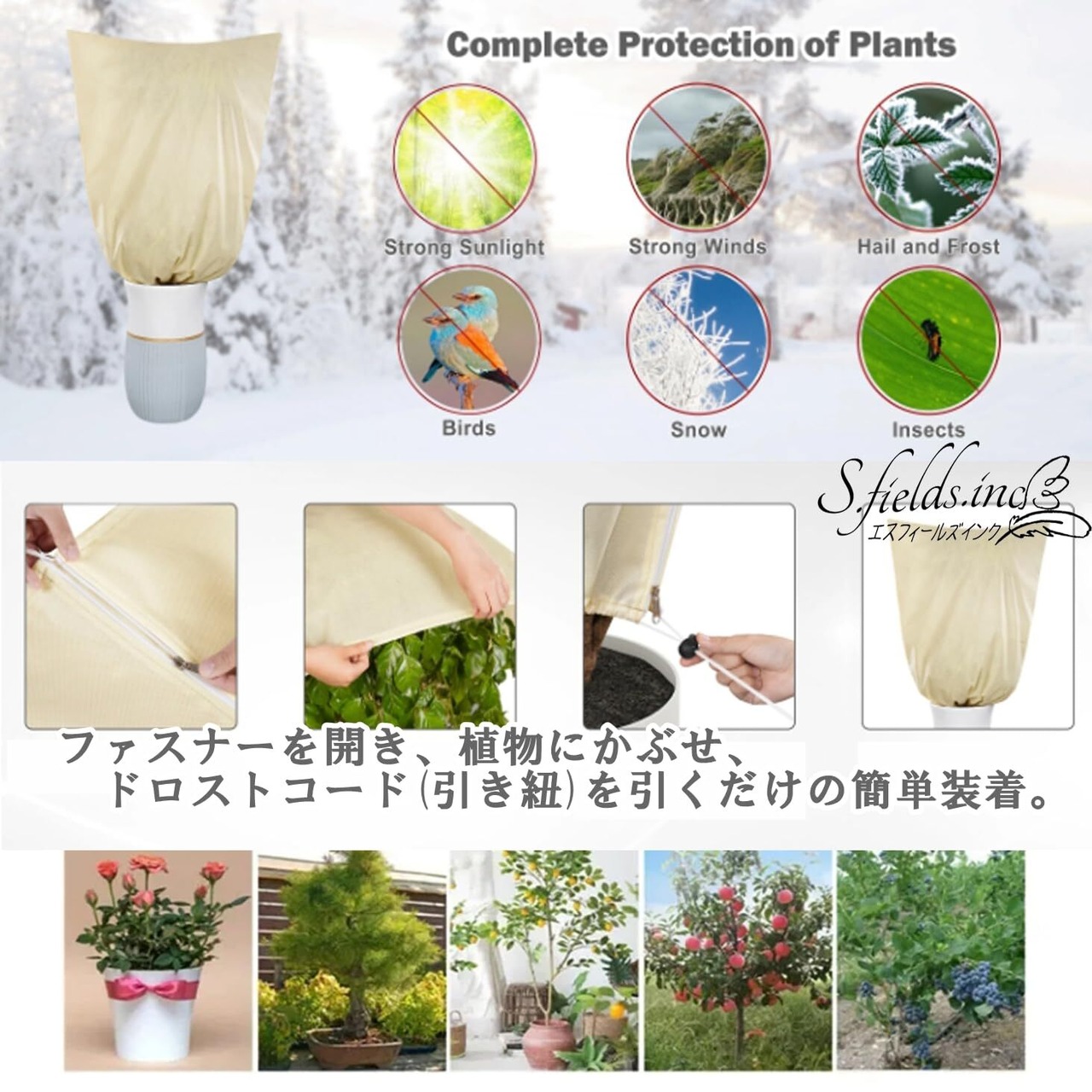 ファスナーとドロストコード(引き紐)付きなので、植物を傷めることなく簡単に装着することが可能です。