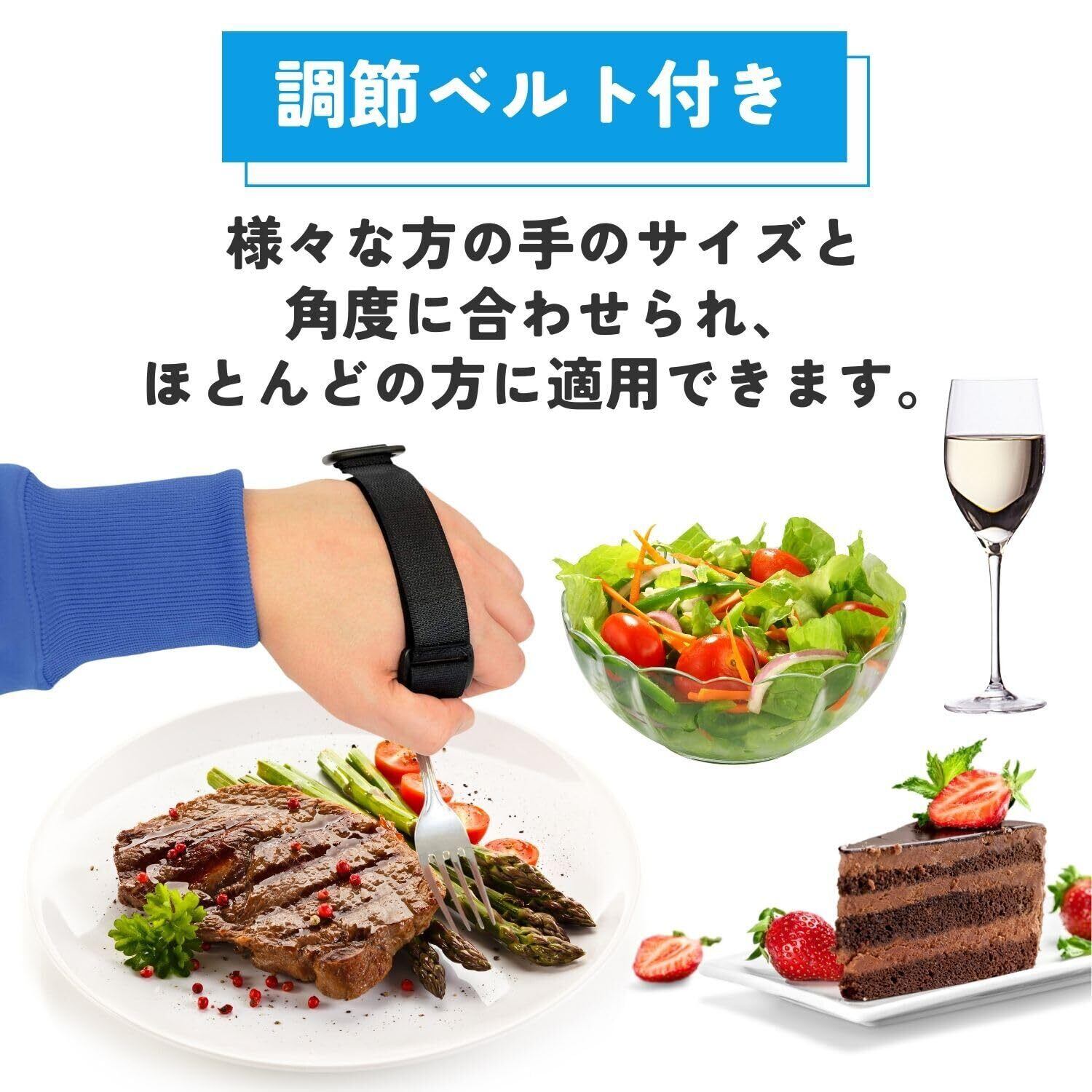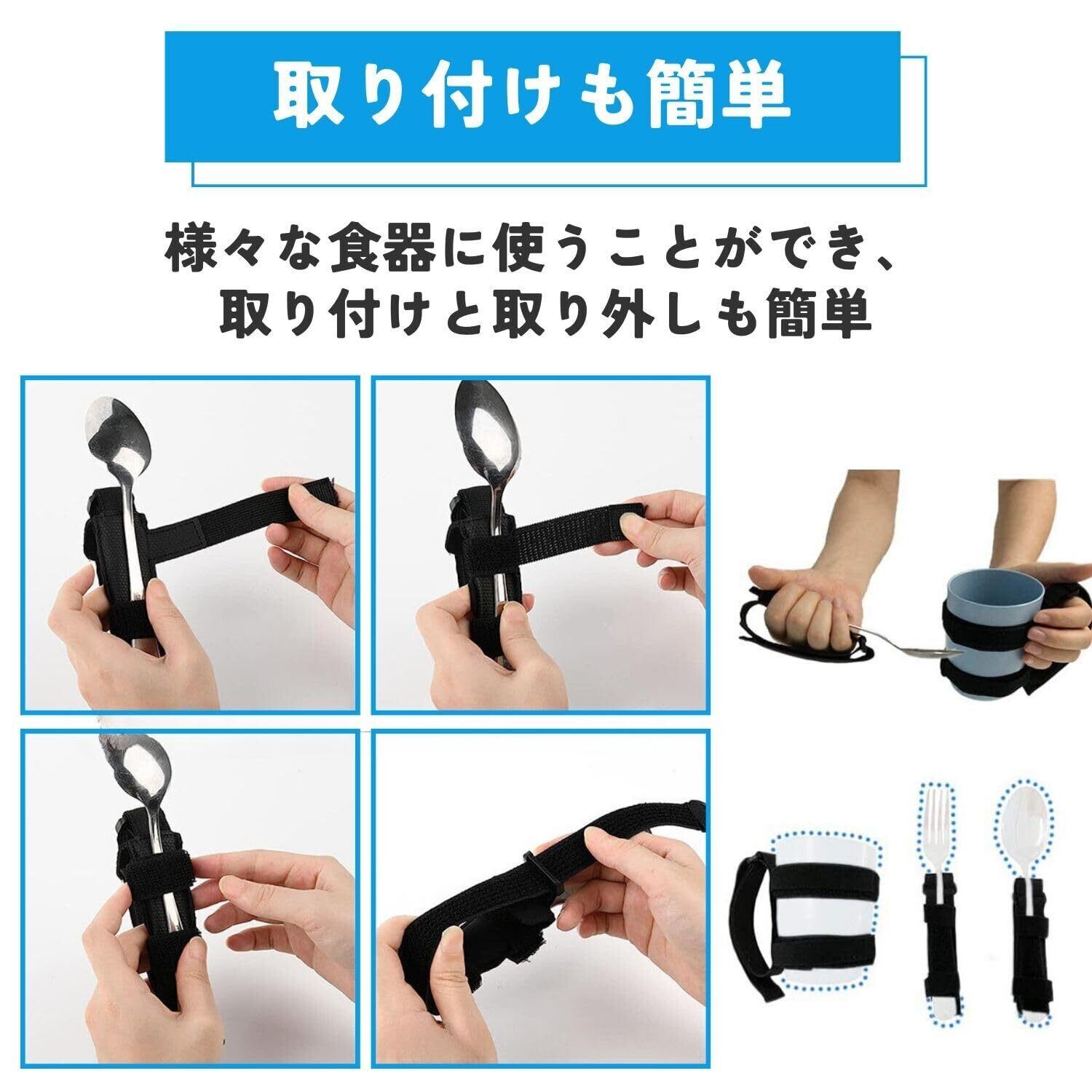 調節可能でマジックテープ固定のデザインにより、スプーンやフォークだけでなく、コップやペンなどの様々な器具に対応。