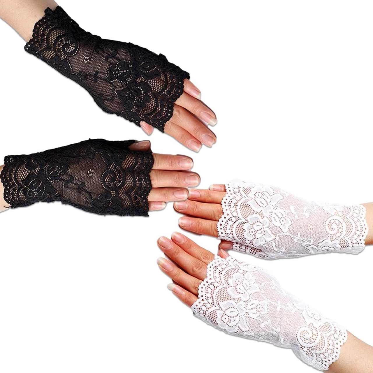 [ルボナリエ] 手袋 日焼け防止 レディース レース 指なし ショートタイプ アームカバー エレガント ウエディング ドライブ 2色 セット (黒レース+白レース)