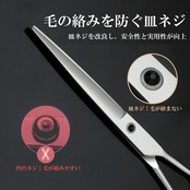 【絡みを防ぐ皿ネジ】 刃と刃を留めるネジは、凹凸のネジの場合、毛が絡み操作性が低下してしまいますが、本商品3本のシザーは皿ネジを使用しておりますので毛が絡まず快適に作業を行うことができます。