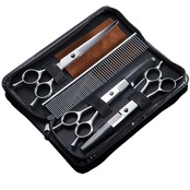 【トリミング6点セット】 トリミングのベーシックツール6点セットとなります。①ストレートシザー ②セニングシザー(スキバサミ) ③カーブシザー ④コーム ⑤シザークロス ⑥専用ケース