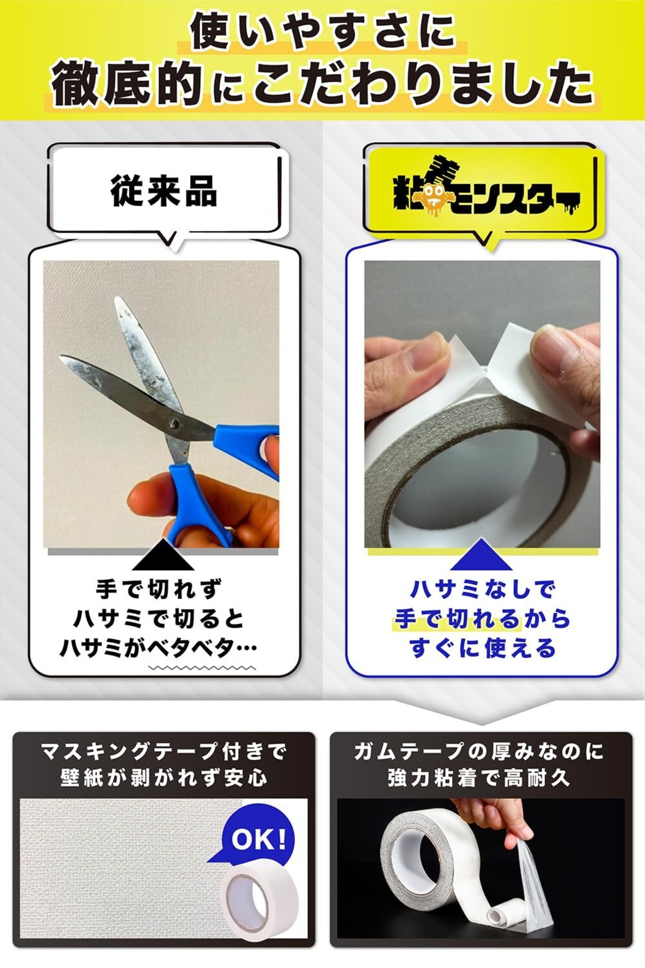 ・【ハサミ要らずで使いやすい。すぐに使えるから、作業もスムーズ】「粘着モンスター」は、手でも切れる設計でDIY作業で煩わしいハサミがなくても使えるようにしました。必要な長さにカットして、すぐに使える利便性が魅力です。スムーズな作業でDIYの効率を高めます。簡単なステップで、誰でも手軽にDIYを楽しむことができます。