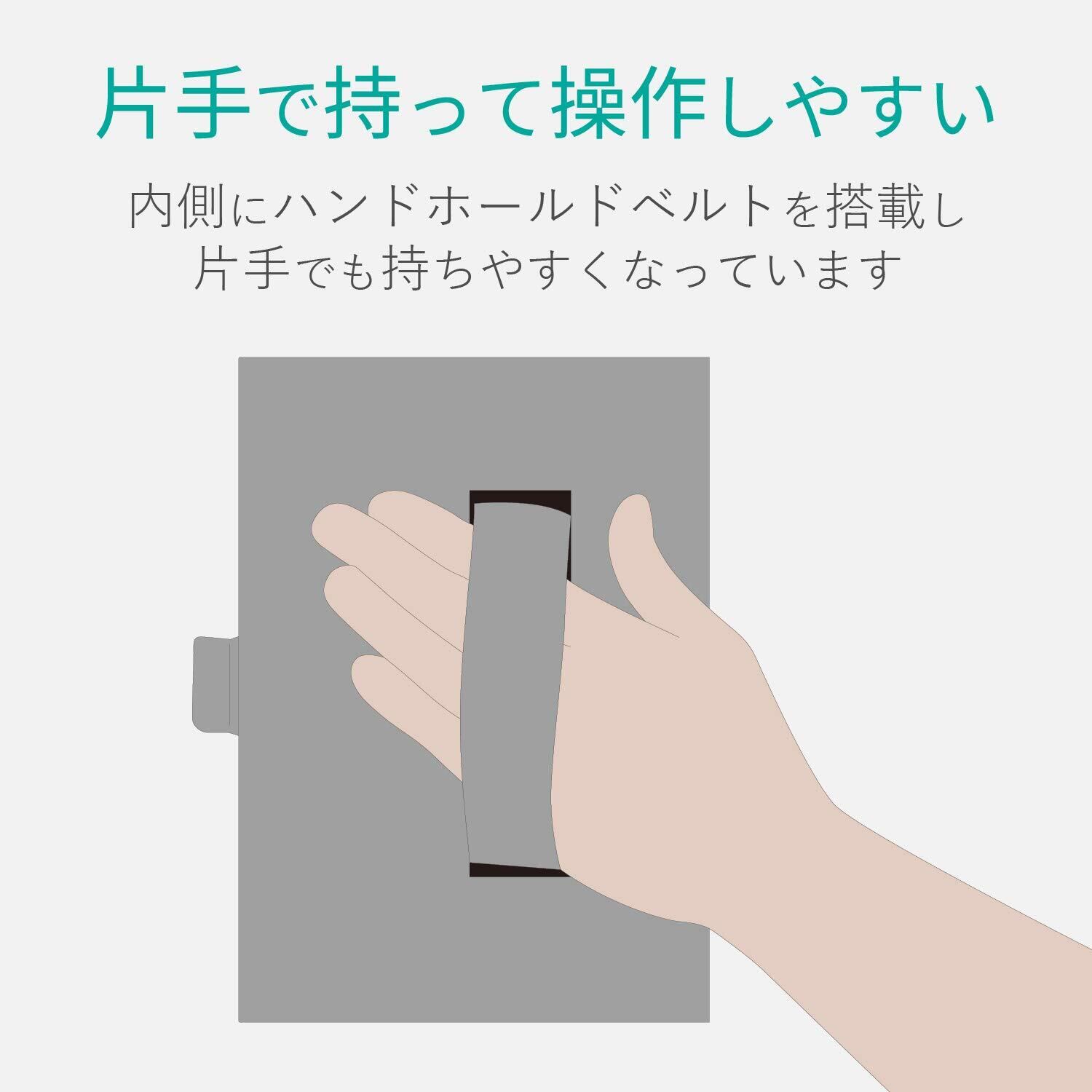 ■片手で持って操作しやすい、ハンドホールドベルトが、フラップ内側と一体化しスマートに収納されています。