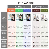 【上質紙タイプの特徴】:上質紙のようにザラザラとした、適度にひっかかりのある描き心地のフィルムです。強い筆圧でしっかりと描き込みたい方に。【他タイプとの違い】:ツルツルとした描き心地、筆圧弱めでサラサラと描きたい方はケント紙タイプをご検討ください。