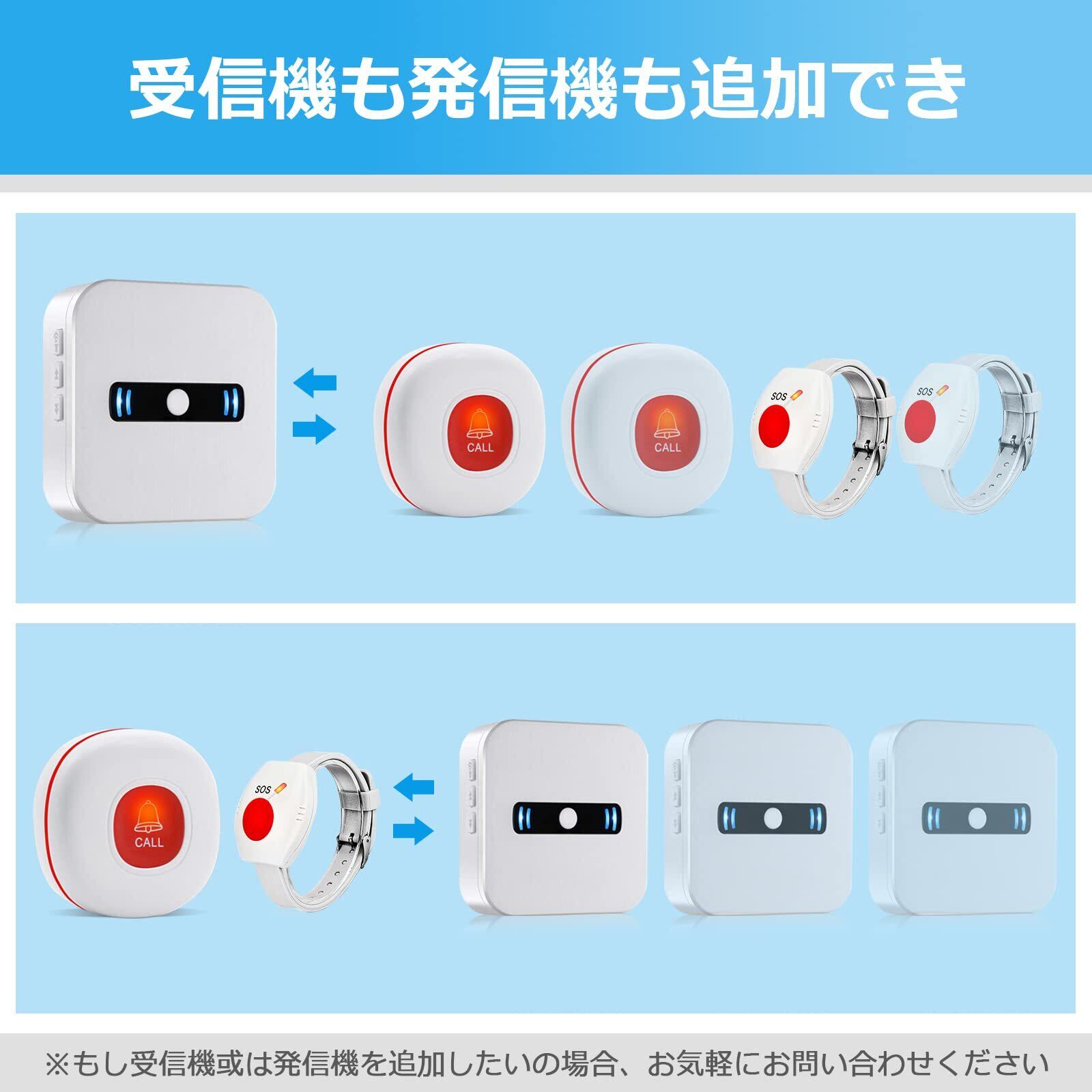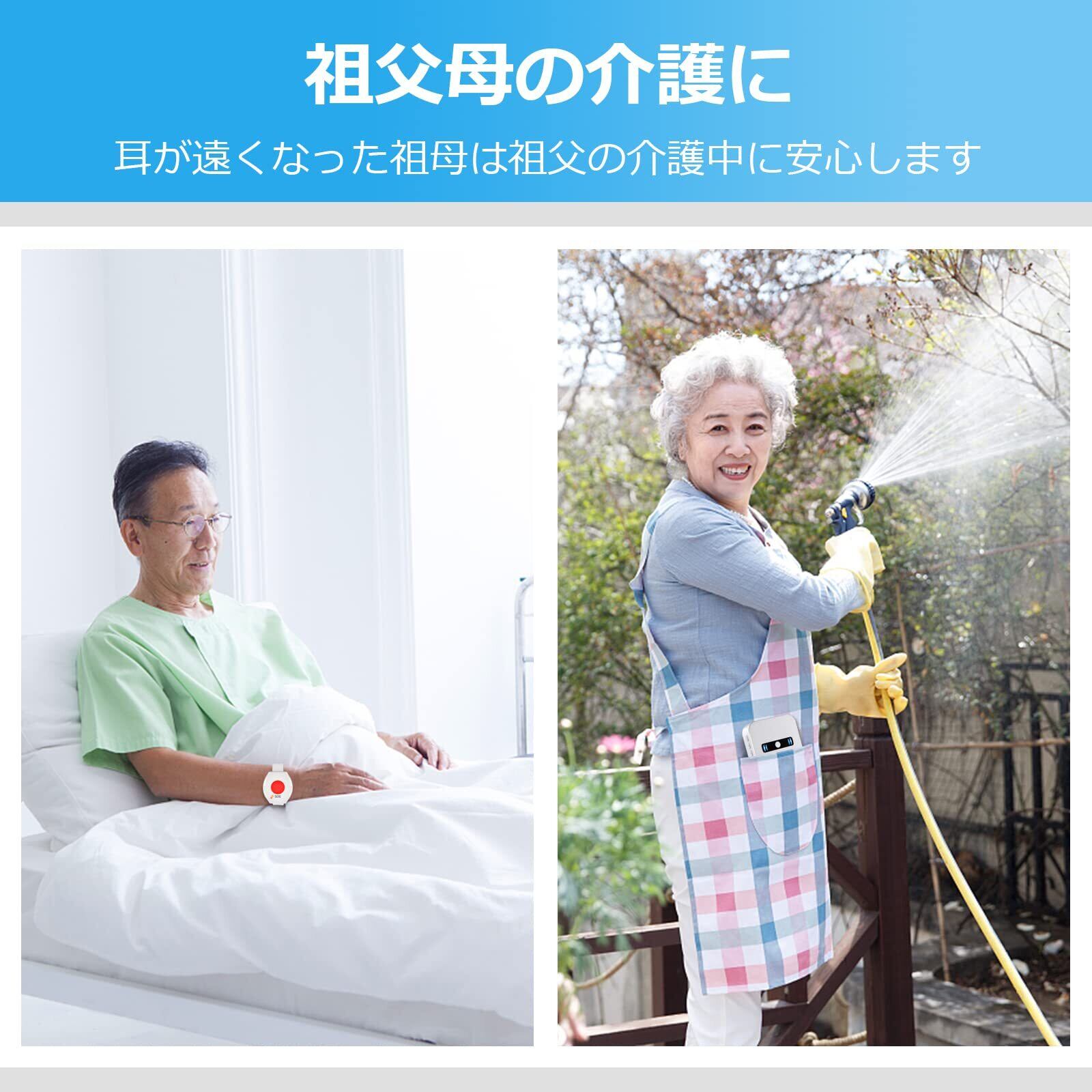 【多用途なコールボタン】丸型コールボタンは介護ベットに取り付けだけでなく、ストラップ取付後携帯もできます。IP55防水設計で、台所でも使用できます。腕時計式送信機は防水ではないので、ご注意してください