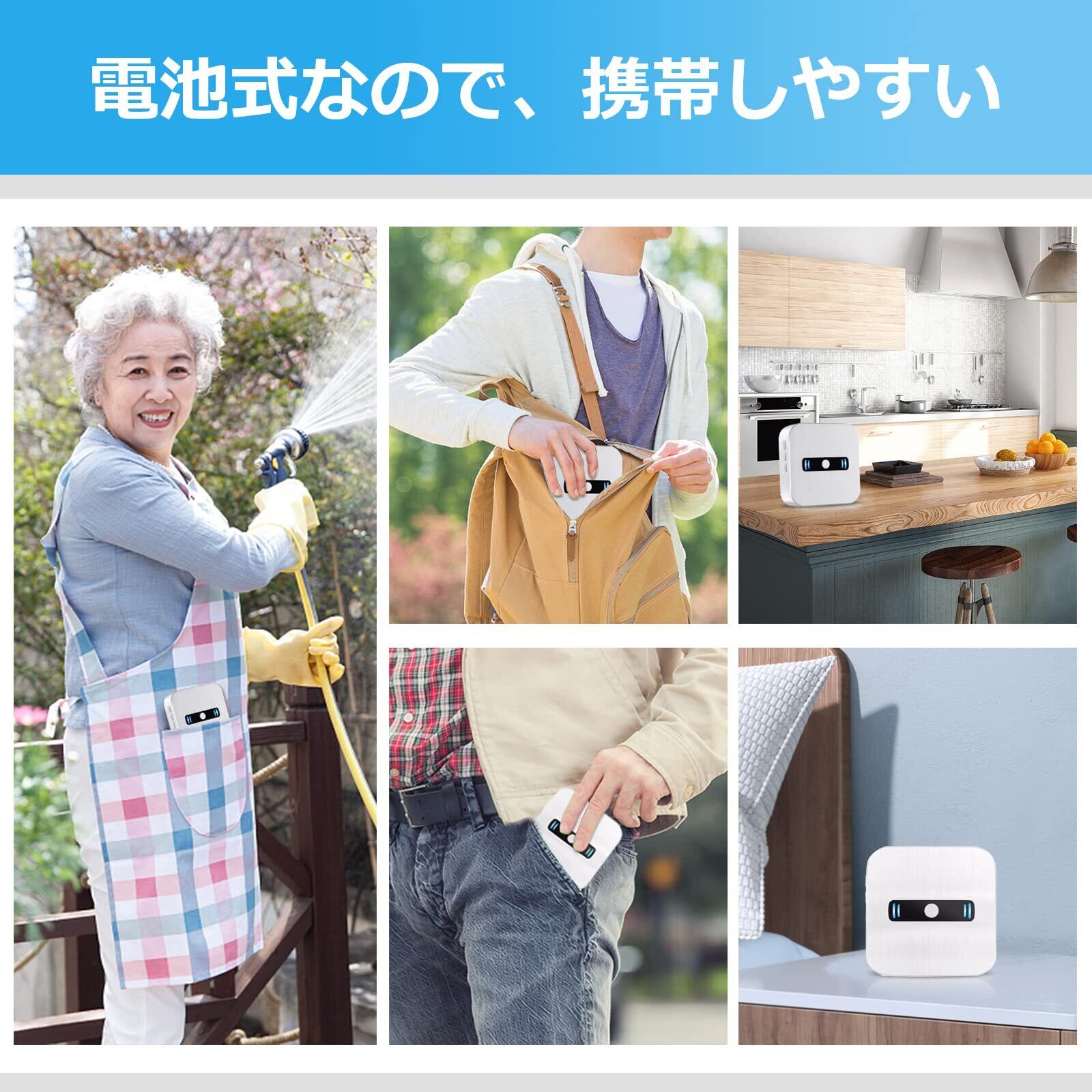 【電池式携帯しやすい受信機】このワイヤレスチャイムの受信機は軽いで電池式なので、ポケットに入れてどこでも携帯しやすいです。家の二階と一階は余裕で届きますし、隣の家と自分の家の間に障害物がない場合、最大100M受信可能です