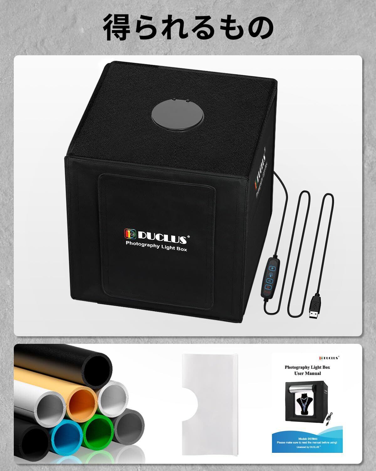 【複数の撮影小道具】DUCLUS撮影ボックスセットには、6枚の滑らかで耐久性のあるPVC背景シート(黒、白、グレー、オレンジ、青、緑)と2枚のマット&反射防止紙背景(黒、白)が含まれており、異なる写真テーマによりマッチします。また、上の穴からの撮影を可能にしながら、光を柔らかくし、影を減らす2枚の光拡散布も含まれています。