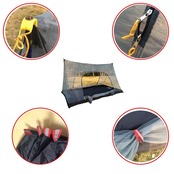 四隅にペグの輪があるのでペグを打っておけば綺麗に張れてます。二つの出入り口(正面2ヶ所)があるため、出入りが楽々です。