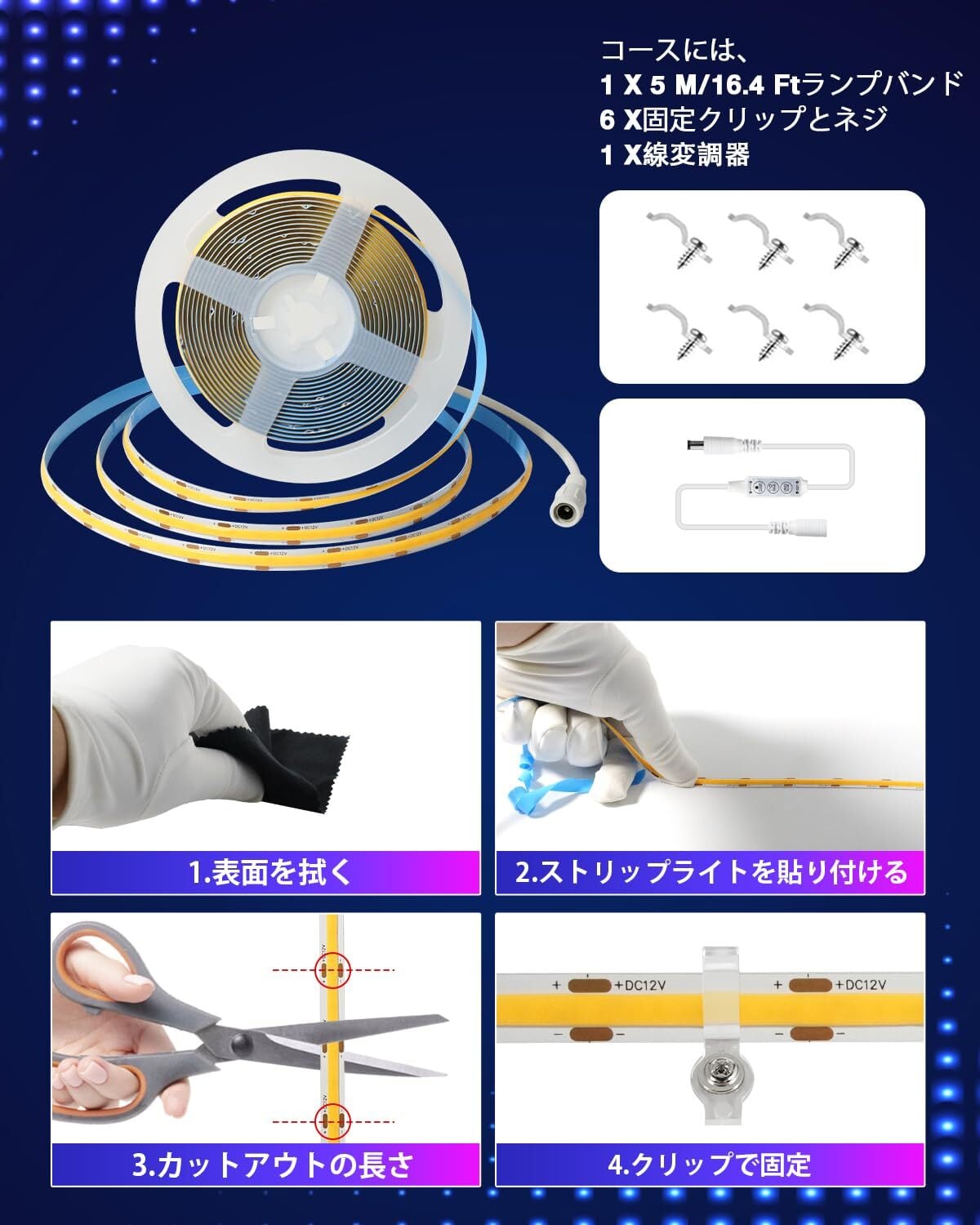 【高演色・超高輝度】COB LEDチップ は通常のLEDライトストリップと比較して、光は均一で柔らかく、効果が優れています。均一な照明を実現するために複数のチップを搭載したLEDレイトは、暗闇を気にする必要がありません。