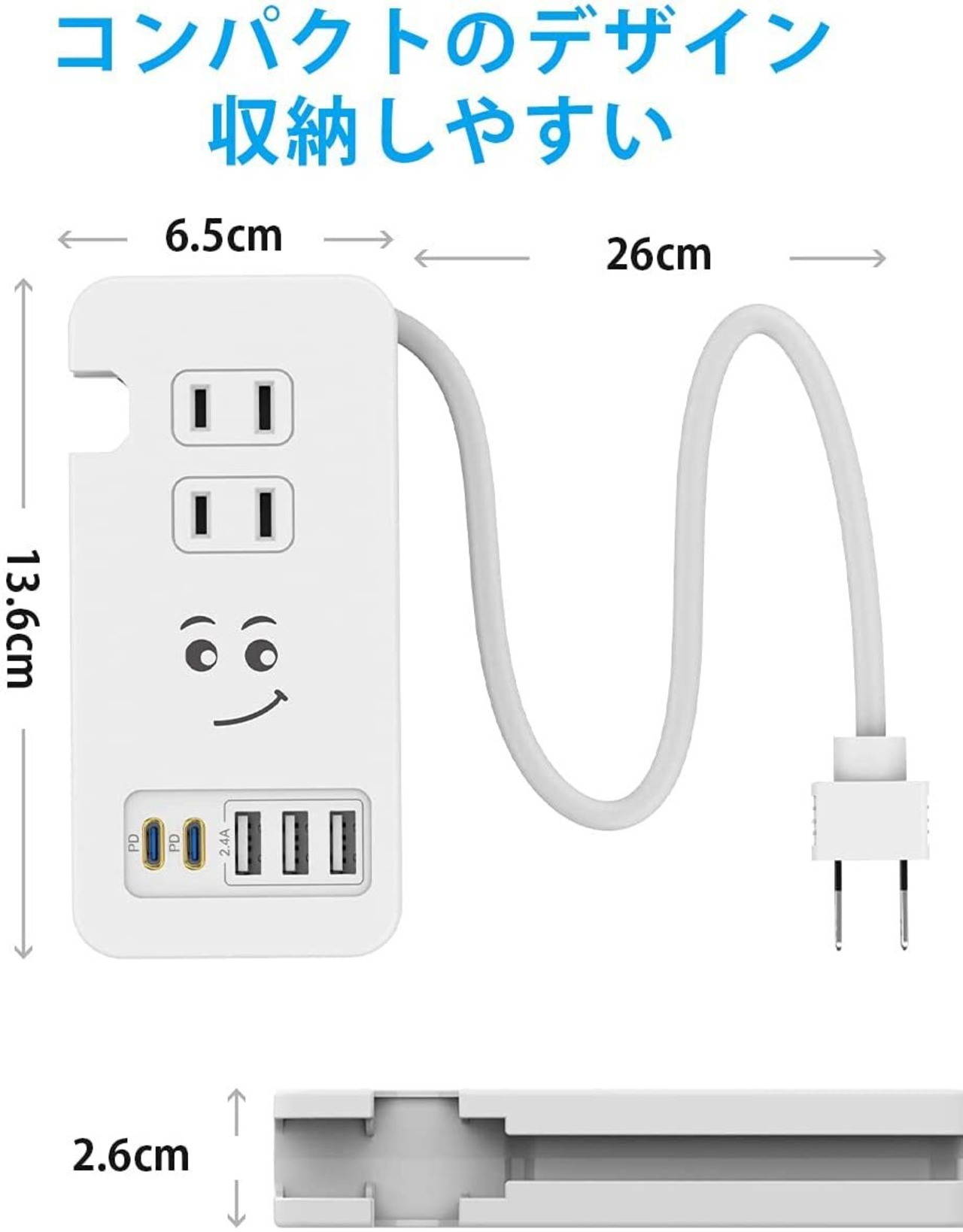 【コンパクトのデザイン】このコンセントのサイズは2.6cm×6.5cm×13.5cmです。コンパクトのデザインので、本体は手のひらサイズなので持ち運びに便利です。荷物を減らしたい旅行や出張に最適なサイズを実現します。