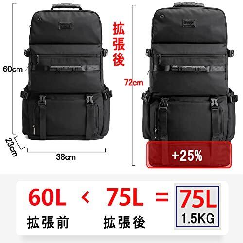 【大容量の75L防水リュックサック】サイズ:約縦60cm(拡張時72cm) × 横38cm × マチ23cm、収納可能サイズ: 60-75L、重さ:1.5Kg。スクエア型収納力抜群、最大17インチPC、Pad、A4サイズの書類や着替え、サングラス、帽子など必要なアイテムを、まとめて収納。キャンプや登山道具、旅行なら3~5泊分の荷物が余裕で入り、タウンユースだけでなく、非常時持ち出し用の防災リュックとしても十分ご活用いただけます。