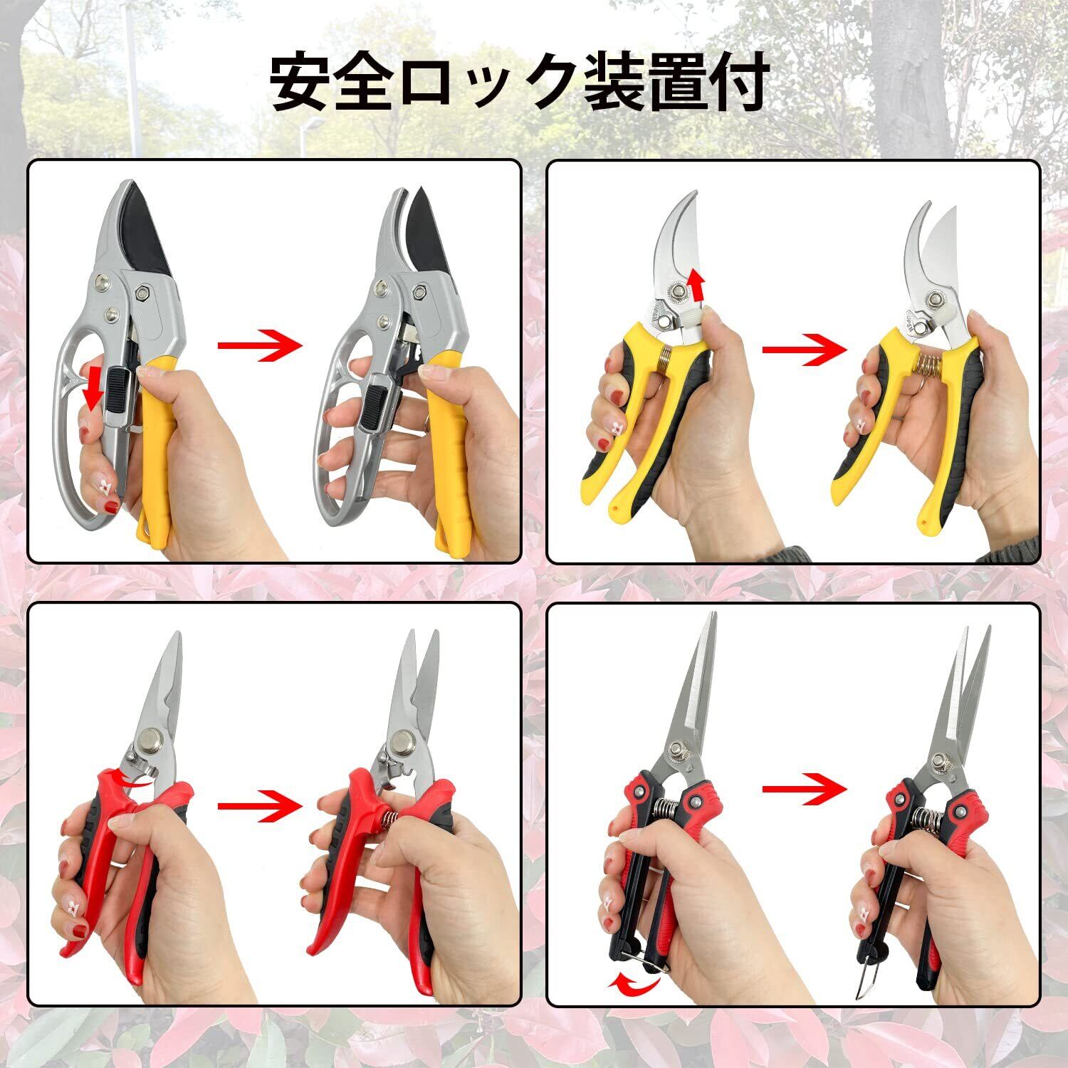 【セット内容】バイパス式剪定鋏*1(木、軟木、繊細な木や植物、生花等の切断) アンビル式剪定鋏*1(堅い枝、枯れ木、自生した強靭な木等の切断) 摘果鋏*1(摘果、芽切、野菜の収穫など柔らかい茎の切断) 鋸歯状の摘果鋏*1(滑り止め鋸歯状デザイン、枝の固定用くぼみがあり、電工ハサミとしても使用可能)