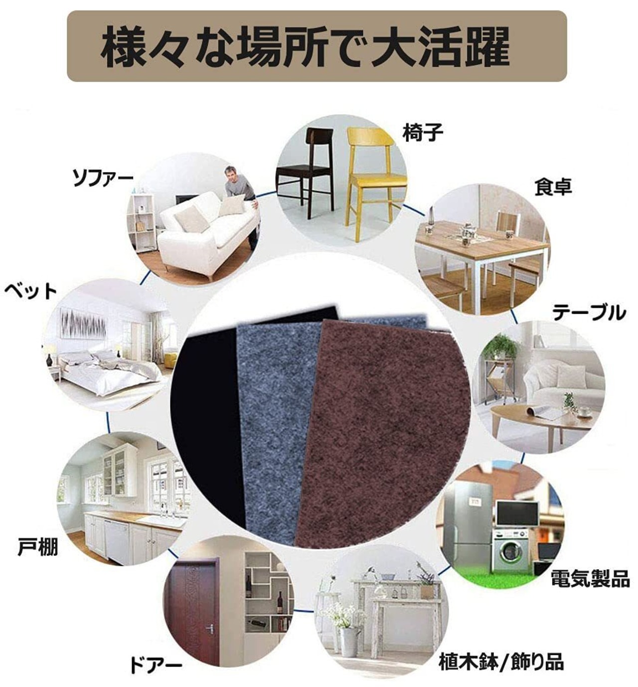 【防音・キズ防止・家具の保護対策】フェルトは厚さが3mm、クッション性も良くて、イスやソファを引いた時床にキズがつくのを効果的に防ぎます。それに、椅子やテーブルや机などの脚による騒音と摩擦を減少でき、スムーズに移動もできます。床に傷と騒音を防止すると同時に、家具の保護にも役立っています。