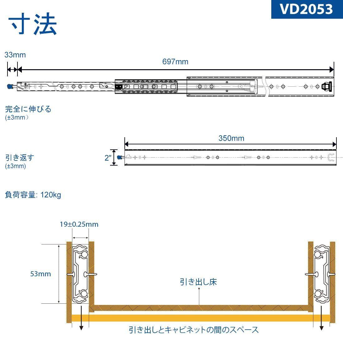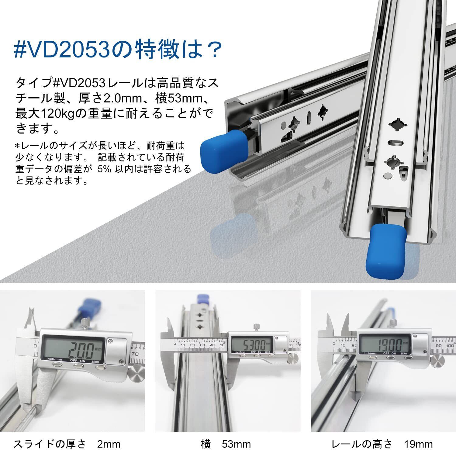 最大120kgの重耐荷重 --- #VD2053シリーズは幅53mm、厚さ2.0mmの最高品質のスチールで作られているため、耐荷重性能に優れています。 スライドレールが長くなると耐荷重が減ります。 記載されている耐荷重データの偏差が 5% 未満であれば、別の用途で許容されるとみなされます。
