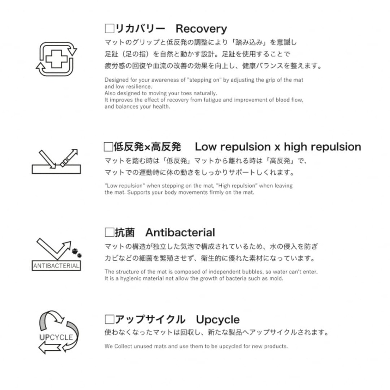 「体の機能をリカバリー」:このマットの開発には理学療法士も関わり、人の足の使い方に着目した素材開発。 マットのグリップと低反発の調整により、人間が「踏み込み」のためによく使用する足趾(足の指)を自然と働かせるように設計。 現代人が失われつつある足の指の動きは実はとても重要で、使わなくなることで縦アーチの低下、外反母趾などに繋がり歩行障害になる恐れがあります。 また足趾を使用することで疲労感を回復したり、血流を改善することができ体全体の健康バランスを整えてくれます。 最大の特徴はマットの使用を継続することで失われつつある足趾の運動を身体認知し、ヨガやその他の自動運動の精度を向上させながら、体全体をリカバリーして継続的に体全体を健康な状態してくれます。