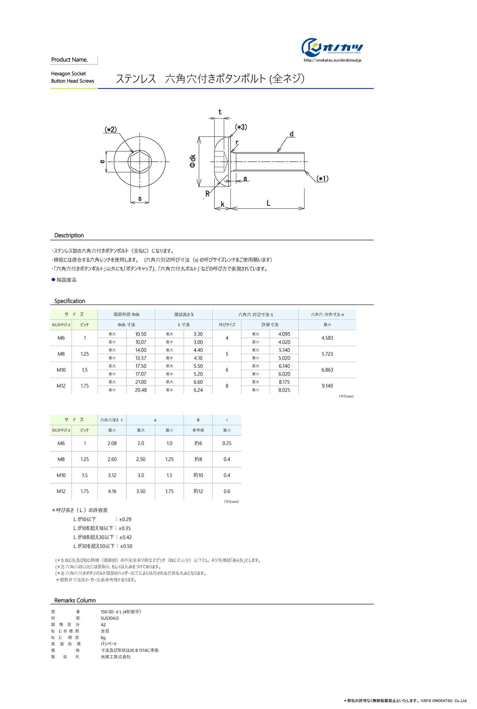 オノカツ ステンレス 六角穴付きボタンボルト M10系 (M10x30 12本入)