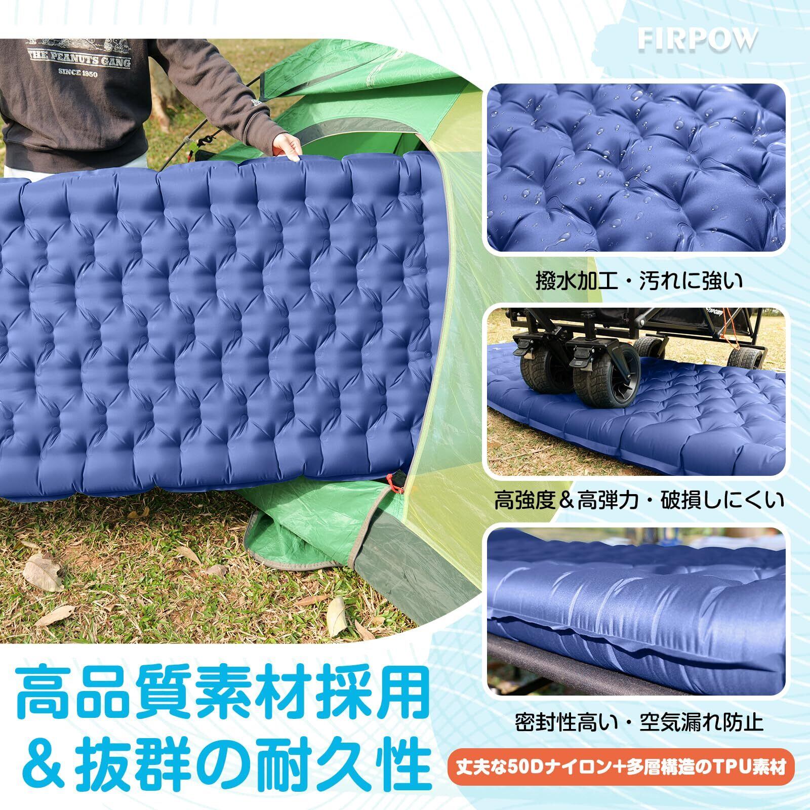 【 高品質材採用、耐久性抜群 】●FIRPOWエアーマットは50Dのナイロンと多層構造のTPU素材を採用、超軽量なのに、最大300kg耐重量、高弾力と耐消耗性が強く、耐久性に優れているなどの特性を持っているため、アウトドアに最もおすすめのキャンプ用品です。●水や汚れにも強い、汚れた場合は濡れタオルで簡単に拭き取ることができ、補修テープも付いており、万が一の場合でも補修できます。