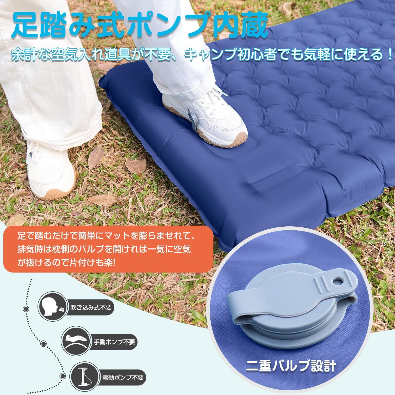 【 余計道具不要、空気入れ&排気簡単 】●FIRPOWキャンプマットはスピードアップの足踏み式ポンプ内蔵、足で踏むだけでわずか約1-3分間に空気入れ完了です。排気時は枕側のバルブを開けるだけで素早く空気を排出できるので、片付けも楽です。●また二重バルブを採用、密封性の高いため、空気漏れの不安もありません。余計な空気入れ道具が不要、キャンプ初心者でも気軽に使えます。