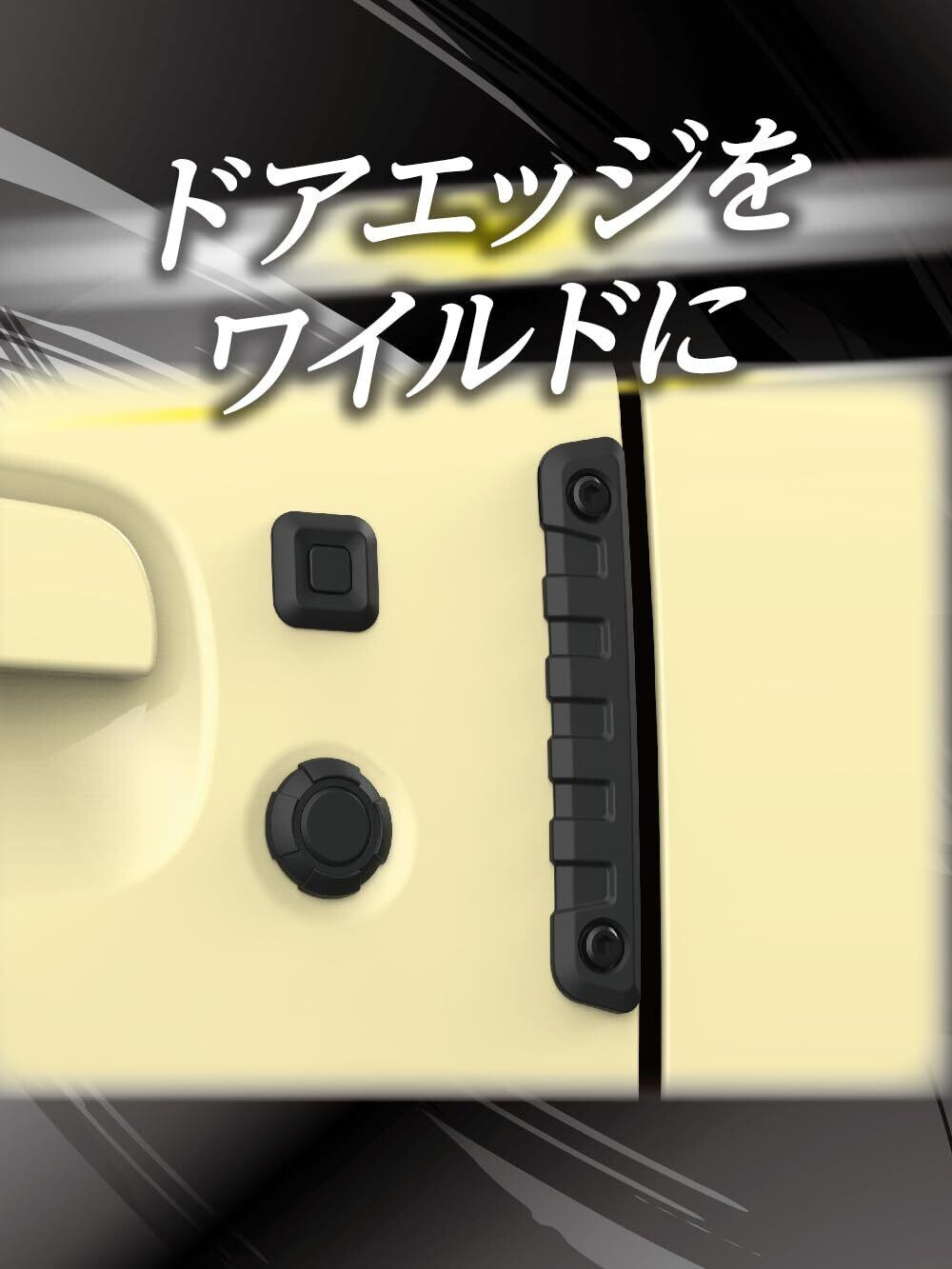 ロングサイズのタフネスデザインプロテクター。飾り六角ボルト付きの無骨なデザインはドアエッジなどに最適。両面テープ貼付け(2個1セット)。