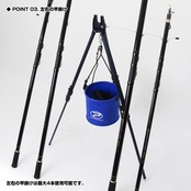 プロックス(PROX) フィッシング三脚。波止釣りやサーフ等で便利なフィッシング三脚。可動式の竿受けでロッド角度調節可能な2WAY、餌付け器セット可能なスタンダードの2タイプ※すべての餌つけ器に対応するものではございません。丈夫で軽いアルミ製のフィッシング三脚。脚は伸縮、竿掛けは折りたたみが可能でコンパクトに持ち運び可能。