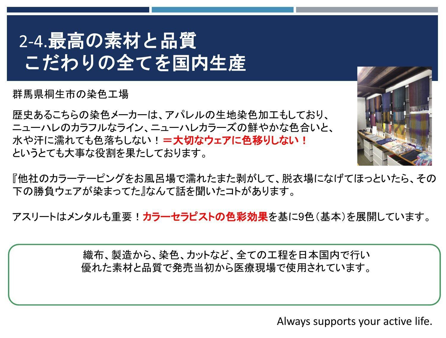 粘着剤自体に柔軟性を持たせることにより、皮膚への突っ張りなどによるストレスの軽減と密着性を持たせています。ニューハレの伸縮糸には日東紡社のC・S・Yを使用しております。