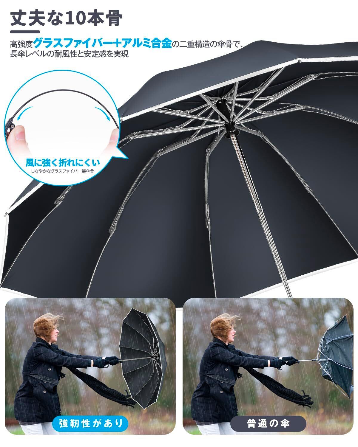 【頑丈な10本骨!台風にも耐える折りたたみ傘】一般的な傘が1本骨なのに対し、DAZOPAGEはグラスファイバーとアルミ合金の二重傘骨を採用し、驚異的な耐久性を実現!風で裏返っても壊れにくい特殊設計です。さらに、10本骨のデザインにより、従来の6本や8本骨の傘よりも安定感抜群。長傘のようなしっかりとした使用感で、台風や暴風雨の中でも安心して歩ける折りたたみ傘です!