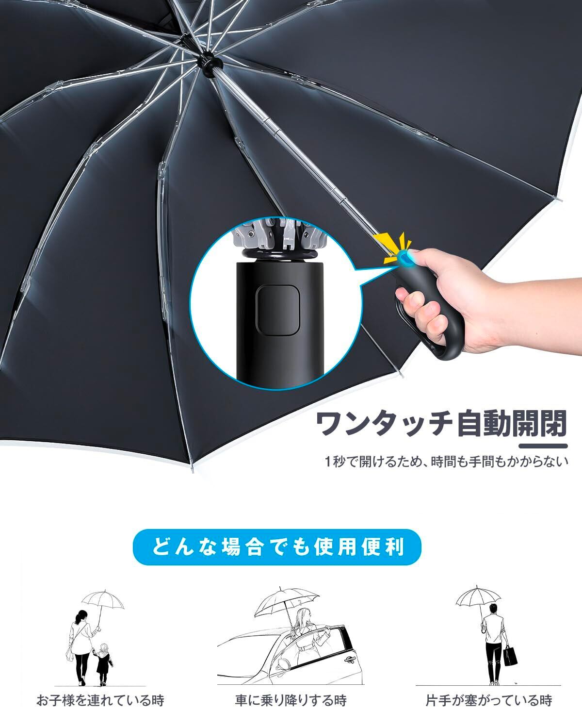 【片手で簡単操作!便利な自動開閉式傘】この自動開閉式傘は、片手がふさがっているときでもボタンをワンタッチするだけで素早く開閉が可能。急な雨や車の乗降時など、様々な場面で大活躍します。特に子育て中の方や通勤で頻繁に傘を使う方にぴったりの便利なデザインです。忙しい日常に、ストレスフリーな使い心地をお届けします!