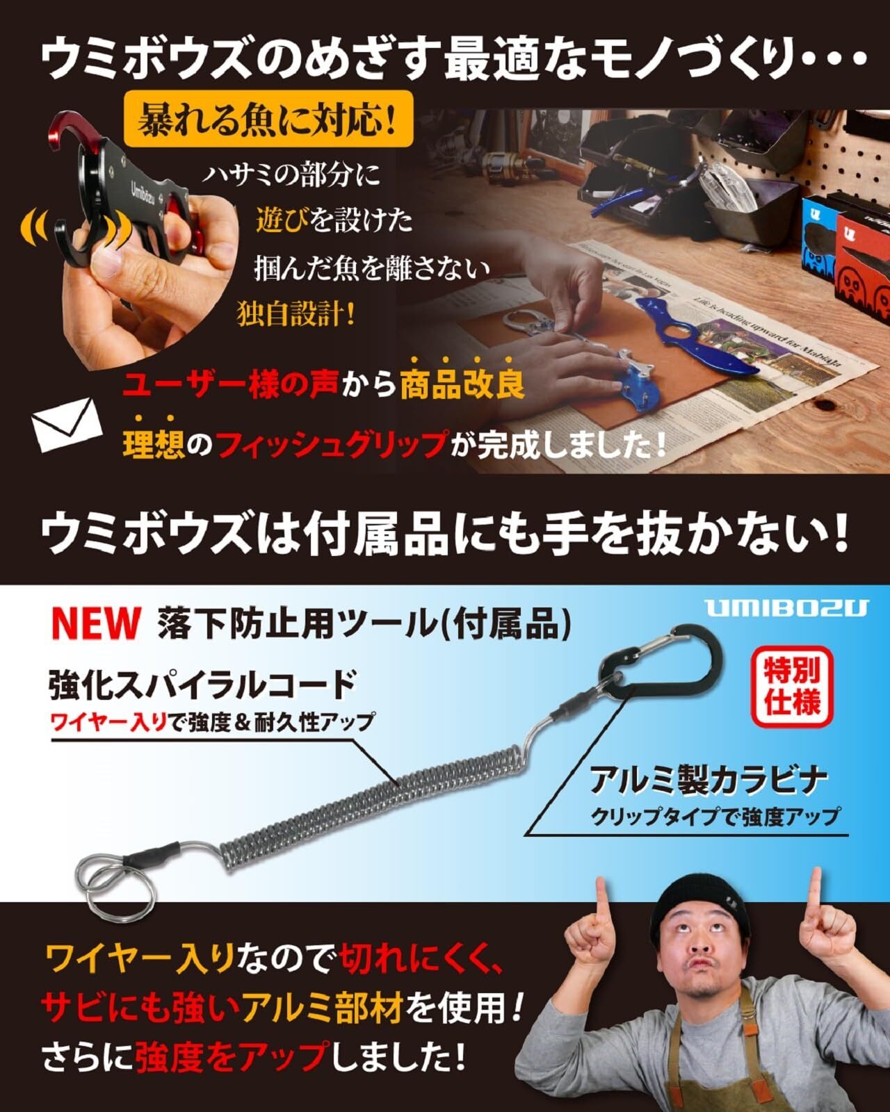 Umibozu(ウミボウズ) フィッシュグリップ 釣り 軽量 アルミ 防錆 魚つかみ フィッシュキャッチャー カラビナロープ付き